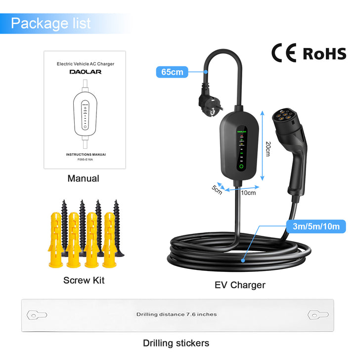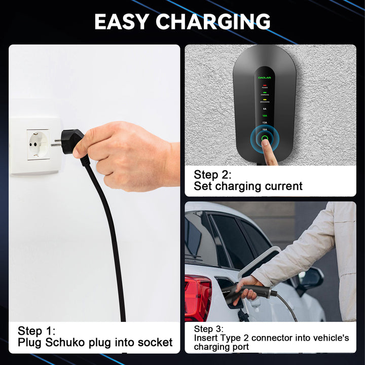 ✅ Høy kompatibilitet: EV-laderen (16A, 220-240V, maks 3,6 kW) kan brukes til alle Type 2 (IEC 62196-2 standard) innkommende elbiler og ladbare hybrider. Den leveres med en praktisk Schuko-plugg, som passer til alle hjemmets 2-pinners og 3-pinners stikkontakter.