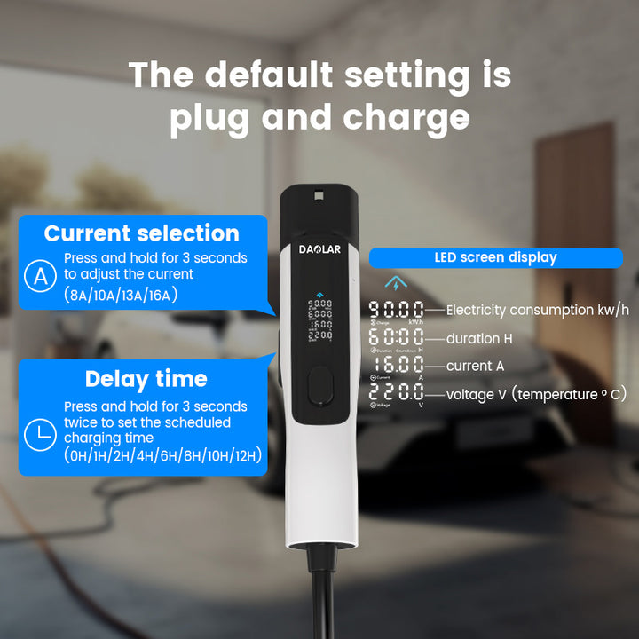 - Justerbar strøm, fleksibel lading: Et enkelt 3-sekunders trykk lar deg **bytte mellom 8A, 10A, 13A og 16A**. Optimaliser lading for ditt hjemmenett eller behov på farten, spar strøm og penger!
