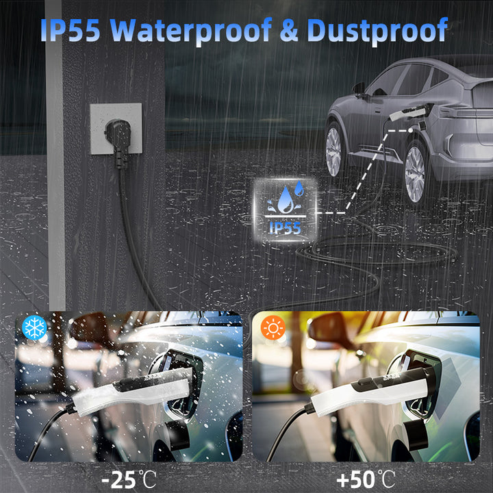- IP55 vann- og støvtett: Bygget med et robust skall, vår **IP55-klassifiserte mobile elbil-lader** tåler varierte europeiske værforhold. Fungerer feilfritt fra -25℃ til 50℃, pålitelig i alle klima.