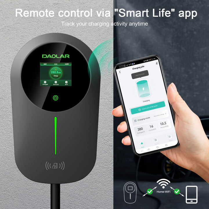 Wallbox-laderen støtter planlagt lading fra 0 til 24 timer, slik at du kan stille inn ladetider til å starte automatisk utenom rushtiden om natten, noe som reduserer strømkostnadene. Med Smart Life-appens fjernkontroll kan du enkelt administrere hver ladeøkt – noe som gjør miljøvennlig kjøring mer økonomisk og effektiv.