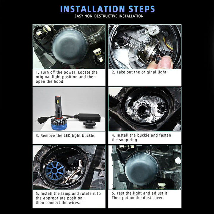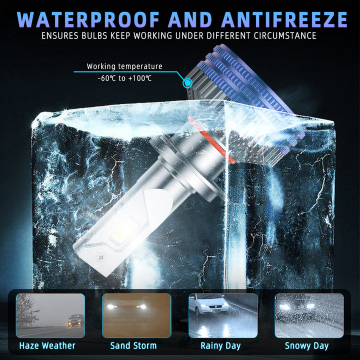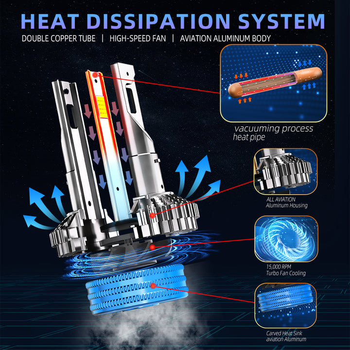 ❄️ Avansert Varmeavledningssystem for 60 000+ Timers Levetid: Konstruert med en bransjeledende varmeledning med varmeledningrør, Doble Kobberrør og et helfly-aluminiumskabinett. En høyhastighets, stille 15 000 RPM turbo-vifte sikrer rask kjøling, slik at pærene kan fungere pålitelig i over 60 000 timer og tåle ekstreme arbeidstemperaturer fra -60℃ til +100.