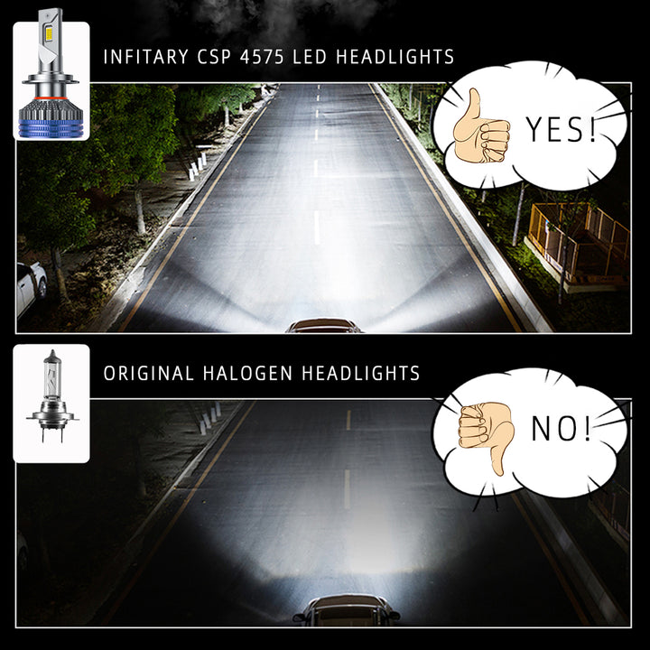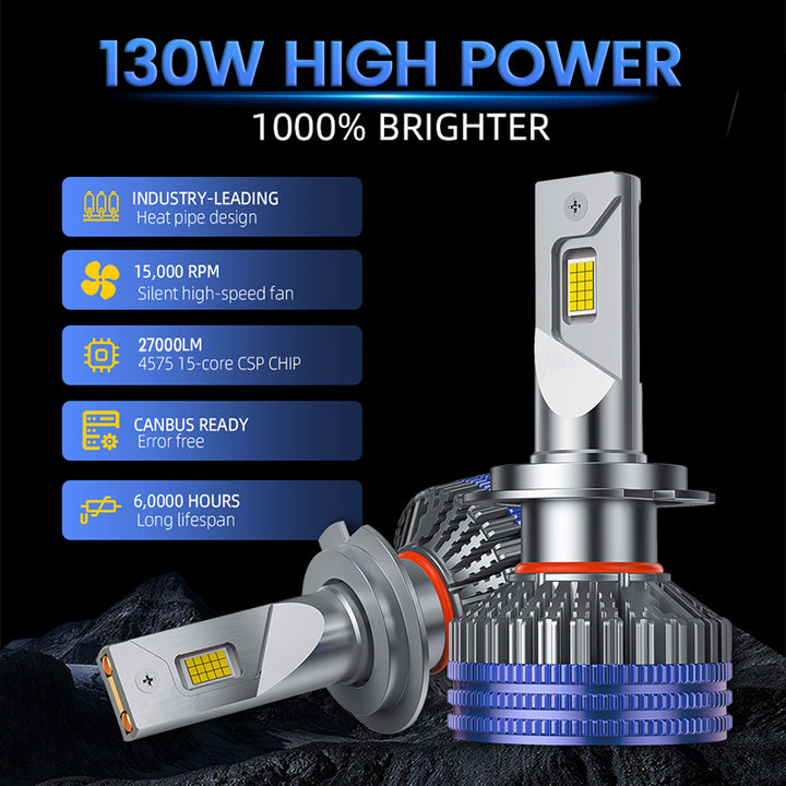 ⚡ 1000 % Lysere & Ultra-Fokusert Stråle (27000LM, 130W): Oppgrader fra svake halogenlys til en bransjeledende 130W (per sett) høyytelseseffekt, som leverer utrolige 27 000 lumen med klart, 6500K hvitt lys. Utstyrt med avanserte 15-kjerners CSP 4575-brikker for en superfokusert, bredere og lengre strålemønster, som sikrer tryggere nattkjøring uten mørke flekker.