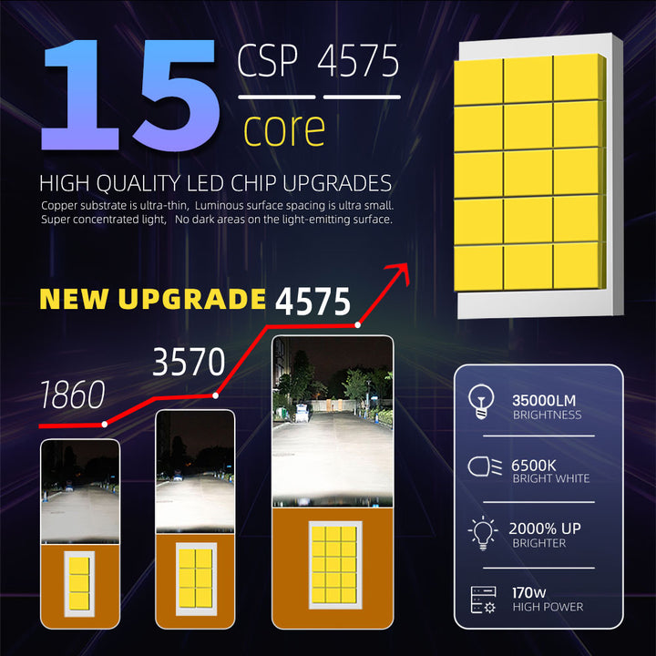EKSTREM LYSSTYRKE MED 15-KJERNERS CSP 4575 CHIPER: Utviklet med den nyeste 15-kjerners CSP 4575 LED-teknologien, leverer dette frontlyskittet hele 35 000 lumen og 170W effekt per sett. Med en fargetemperatur på 6500K kjølig hvitt lys, er disse pærene 2000 % sterkere enn standard halogenpærer, og gir et bredere og lengre lysområde for å eliminere mørke områder på veien.